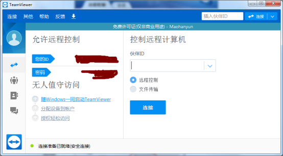 7. 打开teamviewer,记住“您的id”和“密码”,过会要用